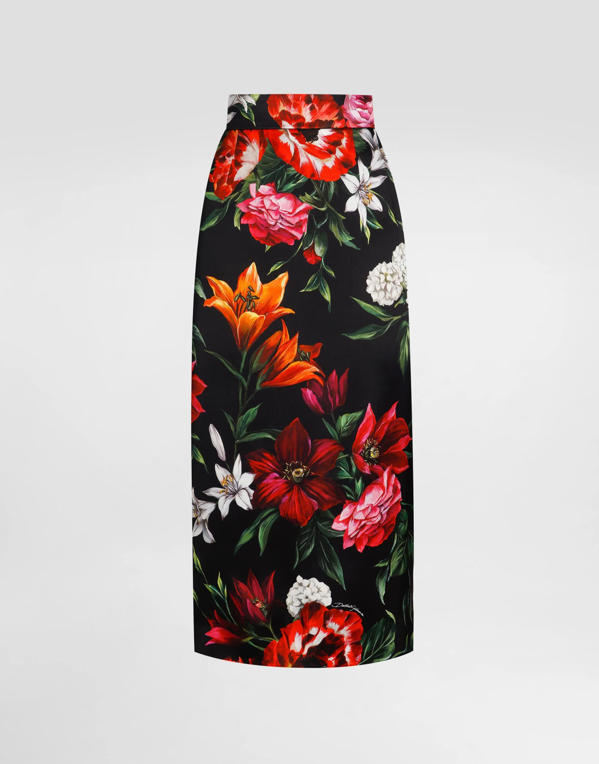 This straight satin skirt with flowers print is a perfect example of elegance and style. A versatile garment that adapts to multiple occasions, combining sophisticated design with unique craftsmanship. Satin skirt with flowers print: • Multi-coloured • Slit at the center back • Covered zipper closure • Lined skirt • The model is 175 cm tall and wears size 40 IT • Made in Italy The difference in the print placement that you may find on this product is a feature of Dolce&Gabbana’s “Handmade” pieces. A detail that makes every garment or accessory unique and exclusive. External Composition: 96% Viscose, 4% Elastane Internal Composition: 91% Silk, 9% Elastane