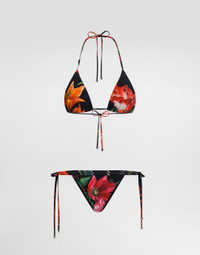 This bikini is an expression of style and originality, perfect for those who love to stand out with a touch of color and fantasy. Triangle bikini in flower print: • Multi-coloured • Sliding triangle without underwire • Fixed thongs with end caps for laces • Made in Italy The difference in the print placement that you may find on this product is a feature of Dolce&Gabbana’s “Handmade” pieces. A detail that makes every garment or accessory unique and exclusive. External Composition: 74% Polyamide, 26% Elastane Internal Composition: 88% Polyamide, 12% Elastane