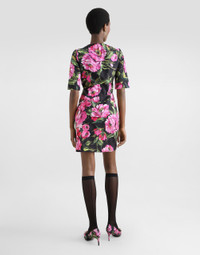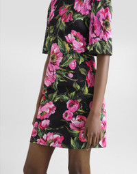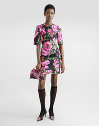 The Women's Black Sicily Collection reinforces Dolce&Gabbana's iconic fabrics and codes rooted in Italian heritage. Sensual silhouettes, highlighted by floral prints and refined corsetry, evoke an intriguing elegance, while the iconic black lace, satin, and velvet dominate the collection. Denim in various shades of blue introduces a contemporary twist, balancing the classic and modern. Embroidered crosses, medals, and jewelry add a sophisticated touch. Fit-and-flare midi dress in peony-print stretch cotton jacquard: • Multi-colored • Round neck • Short sleeves • Dart on waist • Stretch silk crepe de chine lining • Rear zipper and hook-and-bar fastening • The piece measures 52 cm from the waist down on a size IT 40 • The model is 175 cm tall and wears a size IT 40 • Made in Italy External composition: 98% Cotton 02% Spandex Internal composition: 91% Silk 09% Spandex