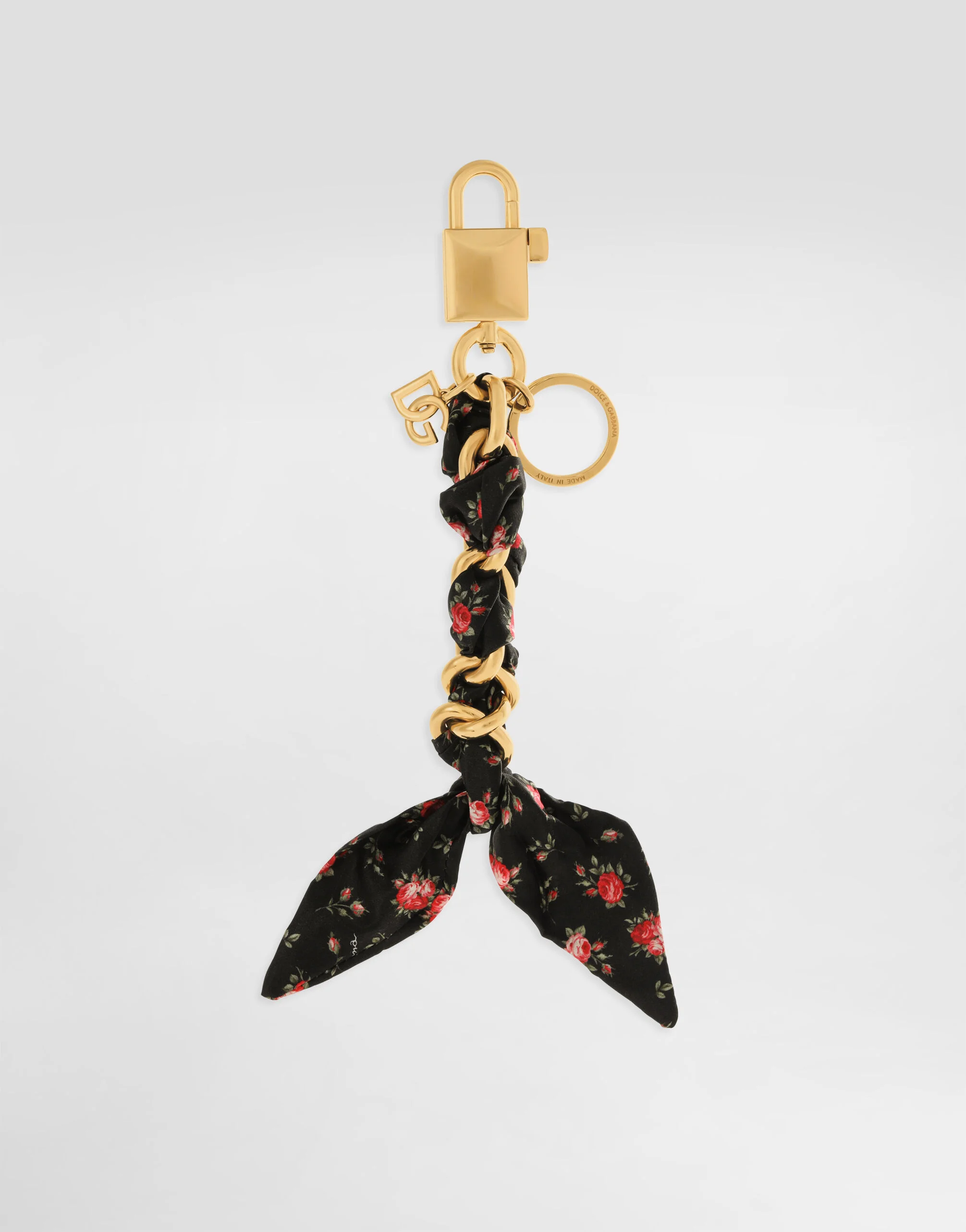 Elegant and functional, the keychain is perfect for adding a touch of style to your everyday accessories. Printed Satin keychain: • Multi-colored • Carabiner closure • Vintage brass plating • External customization with monogalvanic plate • Item equipped with a logo bag and a logoed box • Length: 21 cm • Made in Italy The difference in the print placement that you may find on this product is a feature of Dolce&Gabbana’s “Handmade” pieces. A detail that makes every garment or accessory unique and exclusive. External Composition: 60% Brass, 20% Silk, 20% Aluminum