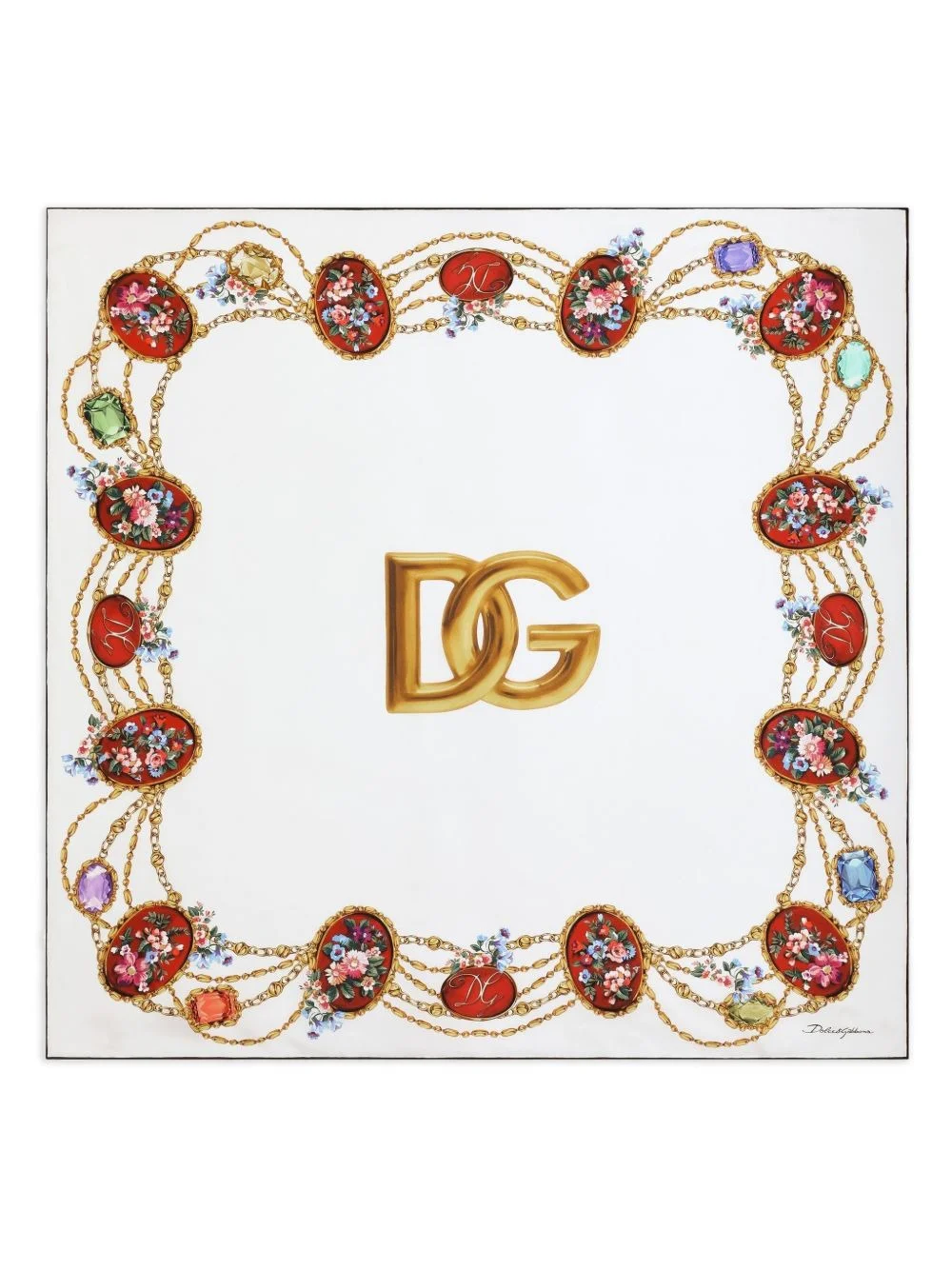 floral-print scarf Highlights - White and multicolour - Floral print - Logo - Jewel detail - Chain embellishment - Border print Made in Italy Composition Silk 100% SIZE & FIT Measurement LENGTH 35.43 in(90 cm) WIDTH 35.43 in(90 cm)