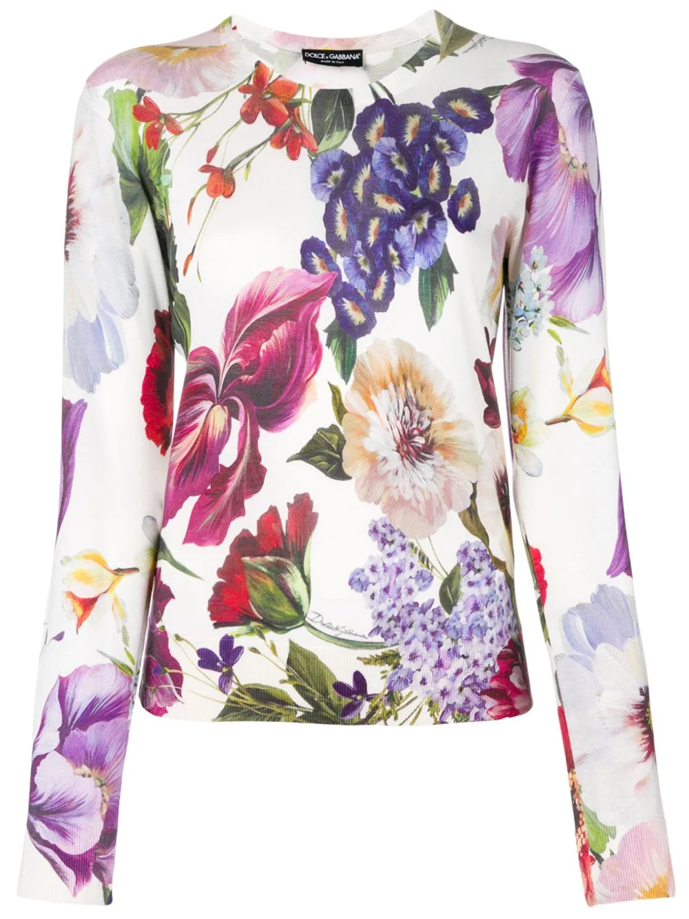 floral print sweater Dolce & Gabbana are the height of romanticism, femininity and Italian luxury. Along with bright colours and signature floral blooms, the designers behind the iconic brand are expert in fashioning timeless essentials for the woman of any age. Equal parts polished and casual, this multicolour silk floral print sweater from Dolce & Gabbana will surely add a dash of colour to your SS19 looks. Featuring a crew neck, long sleeves, a floral print, a slim fit and a ribbed hem and cuffs. Made in Italy Composition Silk 100% SIZE & FIT Model measurements Height 5 ft 11 in(1.8 m) Bust/Chest 31.49 in(80 cm) Hips 35.82 in(91 cm) Waist 24.8 in(63 cm) Washing instructions Dry Clean Only