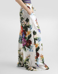These loose trousers are perfect for those looking for a stylish and comfortable look, featuring a floral print that adds a touch of freshness and style. Poplin trousers with flower bouquet print: • Multi-coloured • Regular waist with 5.3 cm high belt with elastic and drawstring • Two pleats at the front waist • French pockets • Double darts at the back with welt pockets • Bottom width 44 cm on size 40 IT • The model is 175 cm tall and wears size 40 IT • Made in Italy The difference in the print placement that you may find on this product is a feature of Dolce&Gabbana’s “Handmade” pieces. A detail that makes every garment or accessory unique and exclusive. External Composition: 100% Cotton