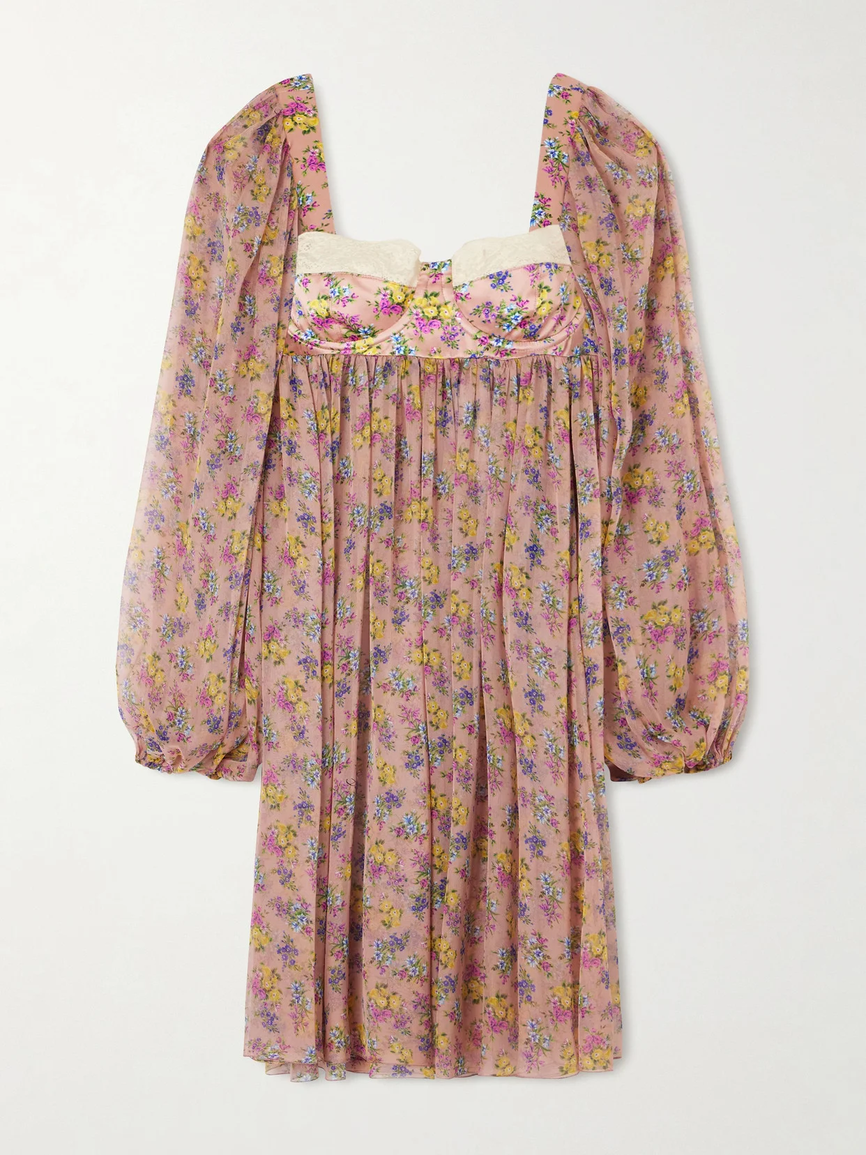 Lace-trimmed Floral-print Silk-blend Satin And Chiffon Mini Dress