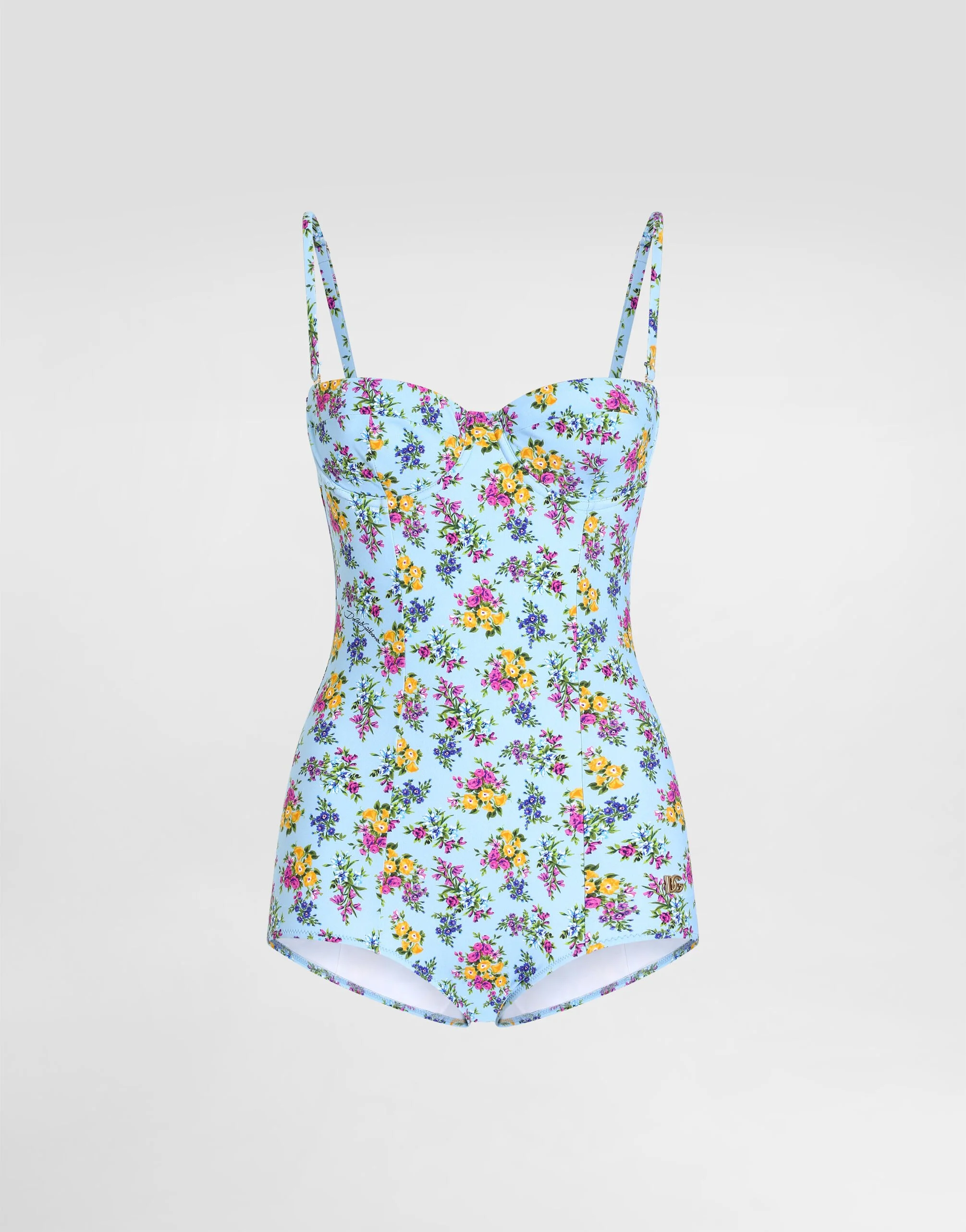 This one-piece swimsuit is perfect for those looking for elegance and comfort on the beach. With a sophisticated design and thoughtful details, it is a must-have for the summer season. Small floral-print balconette one-piece swimsuit: • Multi-colored • Padded cup with underwire • Made in Italy The difference in the print placement that you may find on this product is a feature of Dolce&Gabbana’s “Handmade” pieces. A detail that makes every garment or accessory unique and exclusive. External Composition: 74% Polyamide, 26% Elastane Internal Composition: 88% Polyamide, 12% Elastane