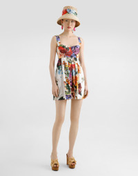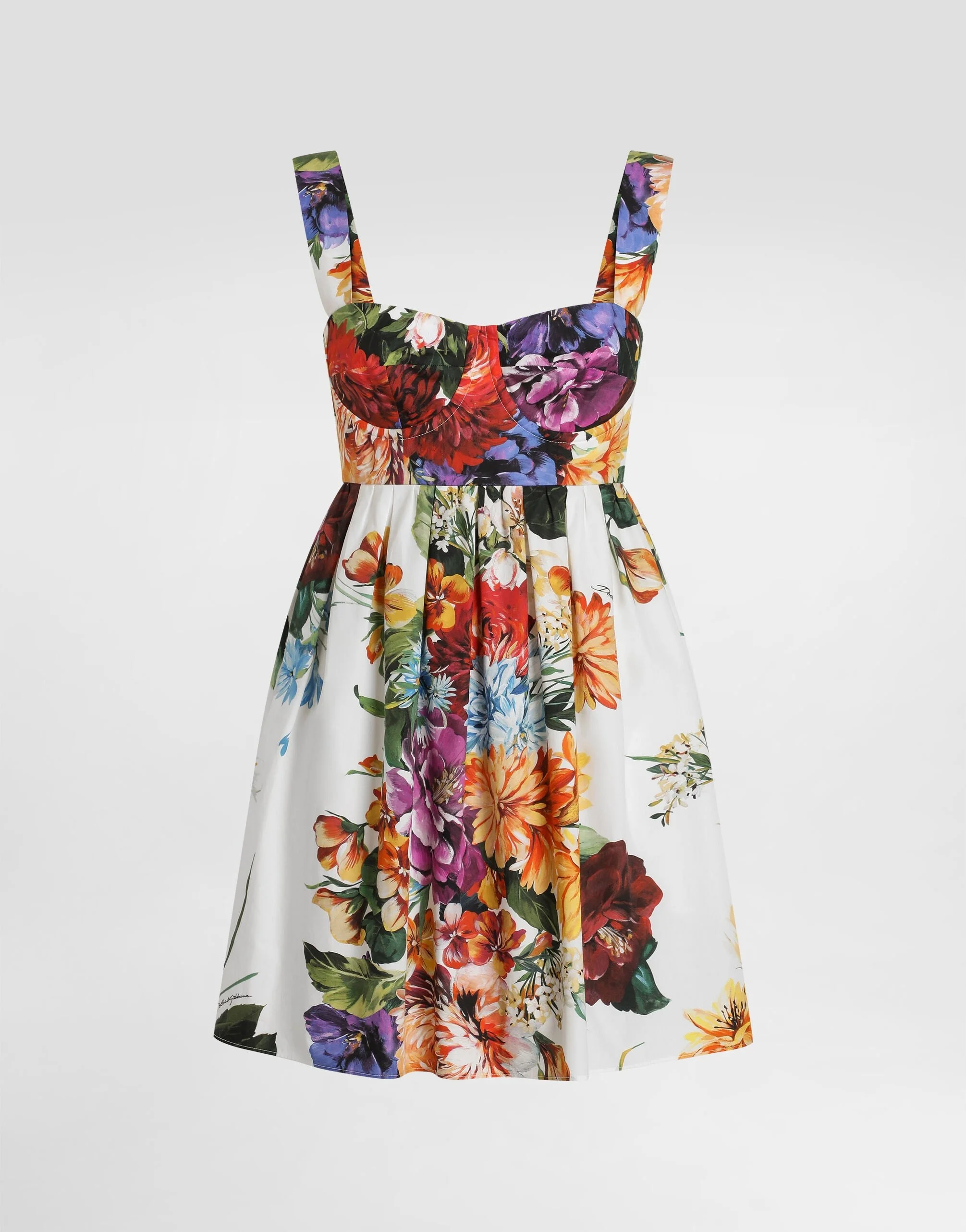 This flower bouquet print poplin dress embodies the freshness and femininity perfect for spring days. With a silhouette-flattering design, it's ideal for a sleek and stylish daytime look. Poplin dress with flower bouquet print: • Multi-coloured • Underbust dress • Wide shoulder strap • Gathered pleated skirt • Pocket with piping in the side seam • Zip opening in the center back • Attached inner coulotte • The model is 175 cm tall and wears size 40 IT • Made in Italy The difference in the print placement that you may find on this product is a feature of Dolce&Gabbana’s “Handmade” pieces. A detail that makes every garment or accessory unique and exclusive. External Composition: 100% Cotton Internal Composition: 100% Cotton