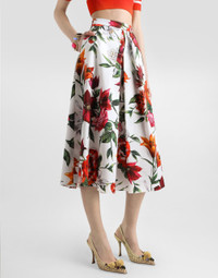 This pleated waist skirt is a versatile and chic piece that is perfect for adding a touch of floral elegance to your wardrobe. Made of printed poplin, it offers a fresh and lively design that adapts to multiple occasions. Poplin pleated skirt with flower print: • Multi-coloured • Skirt with pleats at the waist, 3 cm high belt • Covered zip opening in the center back • Unlined • Welt pocket • The model is 175 cm tall and wears size 40 IT • Made in Italy The difference in the print placement that you may find on this product is a feature of Dolce&Gabbana’s “Handmade” pieces. A detail that makes every garment or accessory unique and exclusive. External Composition: 100% Cotton