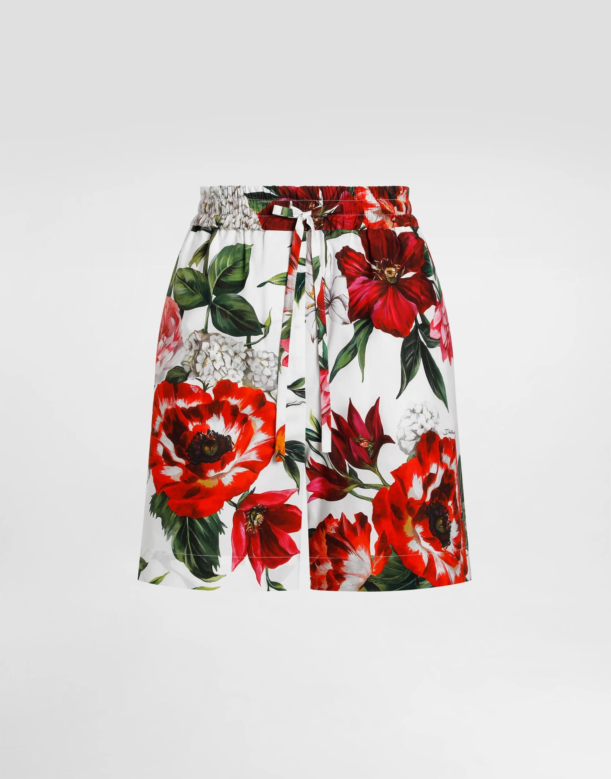 These poplin shorts with flowers print are perfect for a fresh and lively look, combining style and comfort in a single garment. Poplin shorts with flower print: • Multi-coloured • Dolce waist with French pockets • 5.3 cm high belt with elastic and rail stitching • Printed fabric drawstring • Bottom of 35.4 cm on size 40 IT • The model is 175 cm tall and wears size 40 IT • Made in Italy The difference in the print placement that you may find on this product is a feature of Dolce&Gabbana’s “Handmade” pieces. A detail that makes every garment or accessory unique and exclusive. External Composition: 100% Cotton