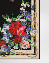 The Spring/Summer 2025 Women’s Collection is celebrating Italian beauty through bold and charismatic femininity. The 50s-inspired lingerie is the star, intermingling with fitted dresses, corsets and oversize trench coats. The iconic jackets have been updated with cropped cuts and modern inserts, while the floral prints add a romantic edge. The eveningwear shines with light fabrics and crystals, accompanied by look-defining accessories, from iconic bags to the cross earrings. Floral-print silk twill foulard: • Multi-colored • Hand-sewn hem • “Dolce&Gabbana” logo • Measurements: 90 x 90 cm • Made in Italy Composition: 100% Silk