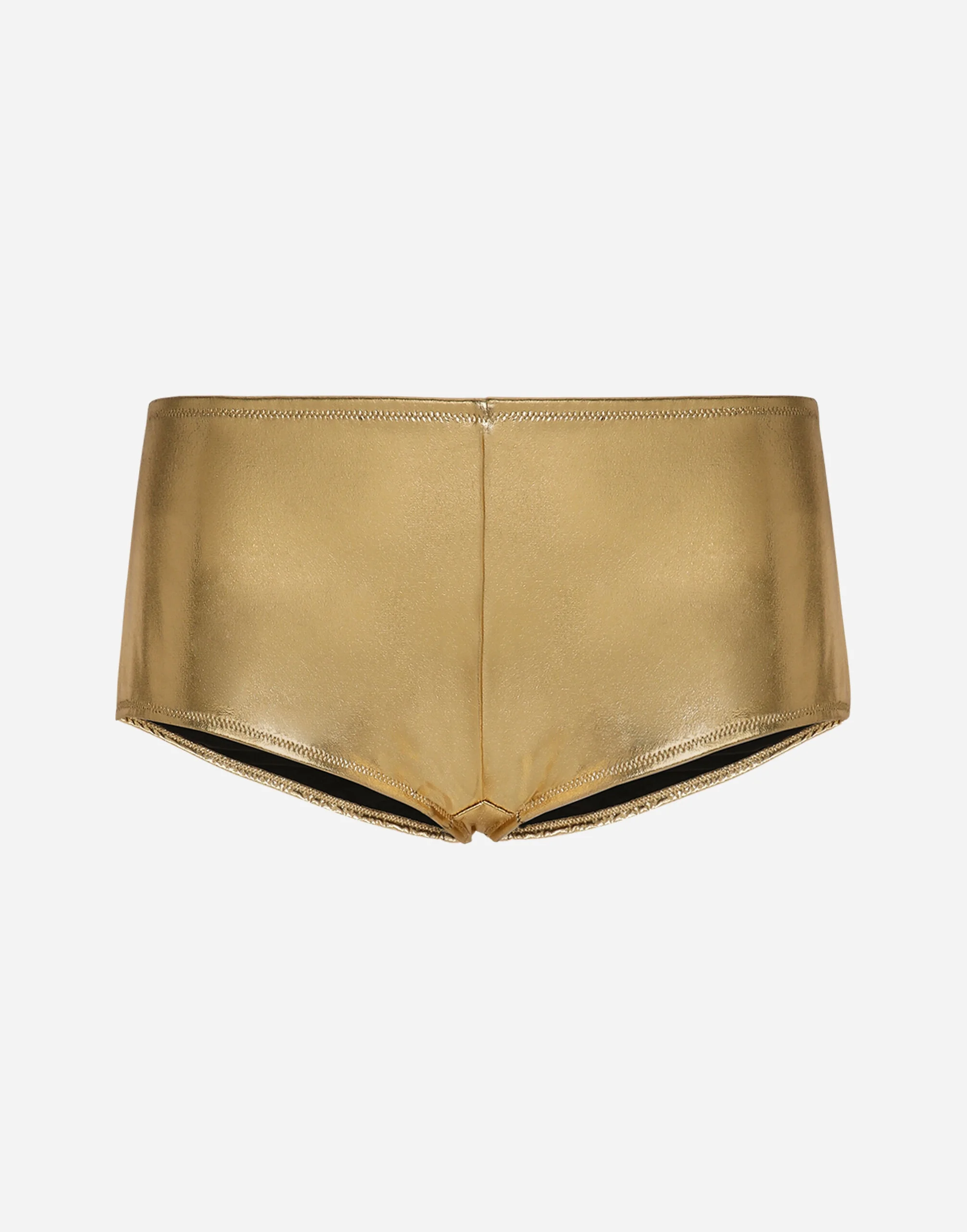 Foiled jersey low-rise panties: • Gold • Low rise • Elasticated leg openings on the front only • Regular fit • Zipper fastening at the back • Made in Italy Given the product characteristics, unfortunately some items in the underwear category cannot be returned. For more information, please consult the Returns and Refunds section. Care And Details External composition: 72% Polyamide 28% Spandex