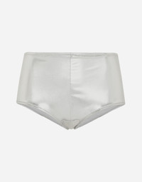 The Holiday collection is an extraordinary story that brings together two worlds: Dolce&Gabbana and the great stars from Hollywood’s Golden Age, who were recognized and admired for their wonderful dresses and extraordinarily glamorous looks. The designers are reinventing and making us dream in front of tailored pieces with breathtaking elegance and visual impact, a sparkling mood that will give everyone a modern, recognizable and unique allure on any occasion. Foiled jersey low-rise panties: • Silver • Low rise • Elasticated leg openings on the front only • Regular fit • Zipper fastening at the back • Made in Italy Given the product characteristics, unfortunately some items in the underwear category cannot be returned. For more information, please consult the Returns and Refunds section. External composition: 72% Polyamide 28% Spandex