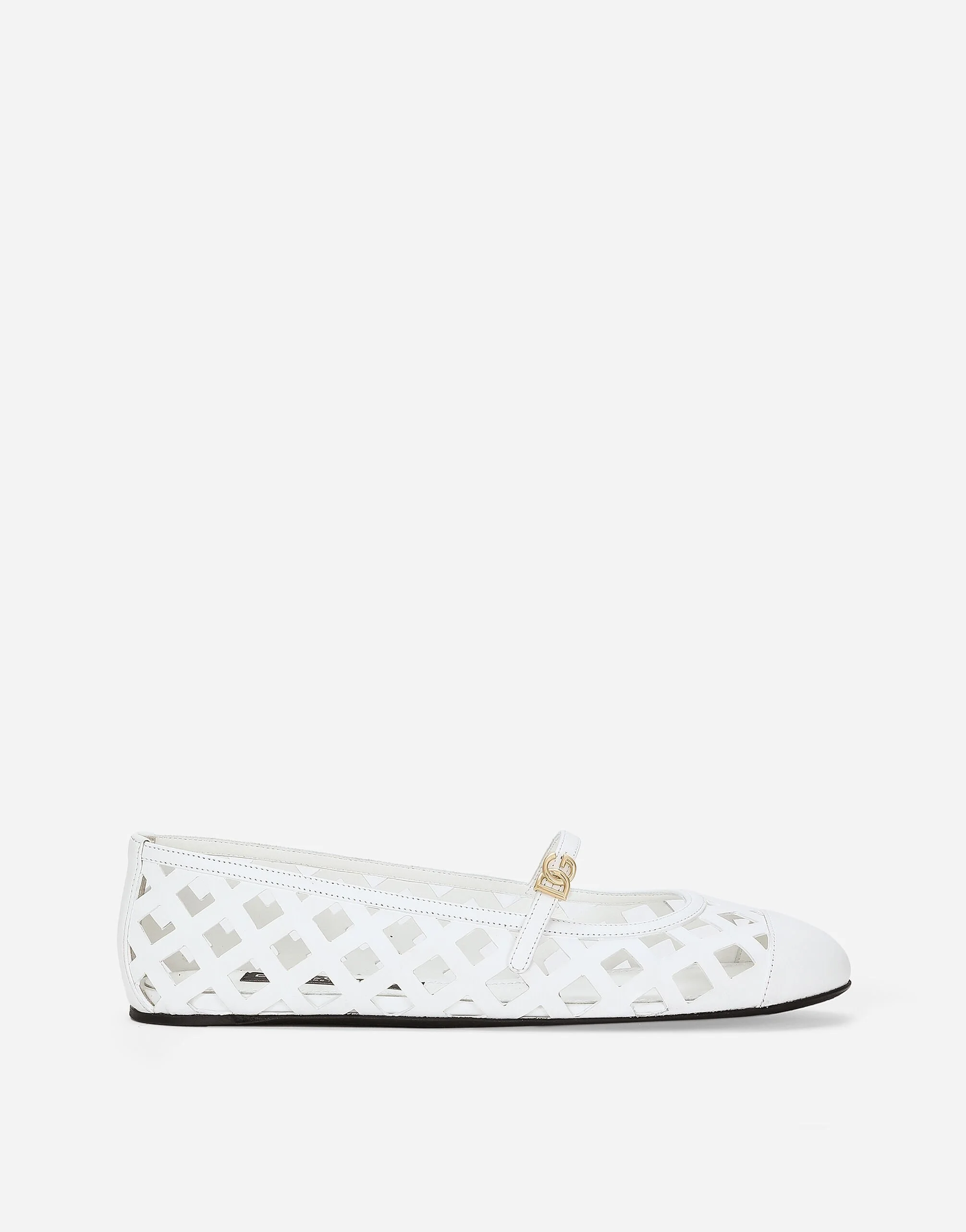 The 60s era is the star of the new Capri collection, where bright and understated white becomes synonymous with elegance and lightness. Odette openwork calfskin ballet flats: • White • Calfskin strap with DG logo • Kidskin insole with branded label • Branded leather sole • Item comes with a branded dust bag • Made in Italy External composition: 100% Calfskin Internal composition: 76% Lambskin 17% Calfskin 7% Goatskin