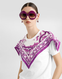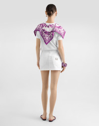 This women's t-shirt combines the simplicity of jersey with the elegance of a silk scarf, offering a versatile and sophisticated look perfect for any occasion. T-shirt with silk scarf: • White • Short sleeves with customized collar with 50x50 triangle scarf • The model is 175 cm tall and wears size 40 IT • Made in Italy External Composition: 70% Cotton, 30% Silk