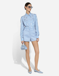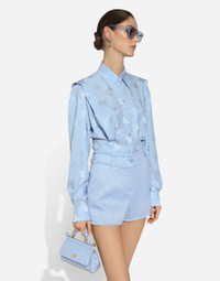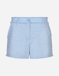 In the FW 24/25 DNA Collection, the rules of classic tailoring have been reworked with an innovative feel. New raschel weave techniques feature on micro-jackets and coats, and original textures are woven on trench coats, skirts, jacquard suits and shirts. The color palette made up of Nero Sicilia black, Milky White and Ocean Blue is also original. The iconic bags in fine nappa leather and “Pyton FC Machine” finish off the looks. Wool raschel tweed shorts: • Light blue • Regular rise • Slant pockets • Belt loops • Inner leg: 6 cm • Hem: 32 cm • Zipper and cannete-covered button with DG logo • The model is 175 cm tall and wears a size IT 40 • Made in Italy External composition: 67% Virgin Wool 27% Viscose 06% Polyamide Internal composition: 92% Silk 08% Spandex