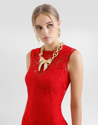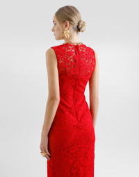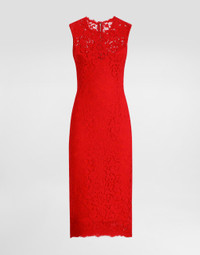 The Everyday Women's Collection reimagines contemporary daily wear with Dolce&Gabbana's signature style codes. Iconic fabrics mix with standout details like embroidered flowers, crystals, and jewel buttons, infusing elegance into every look. Gray animal print accented with green and purple, hyper-geometric jewelry, voluminous shapes and transparencies add unique touches. Men's tweed is reinvented with graphic twists, creating distinctive pieces that reflect refined sensuality. Calf-length sheath dress in floral cordonetto lace: • Red • Round neck • Sleeveless • Stretch silk crepe de chine slip dress • Rear zipper and hook-and-bar fastening • The piece measures 75 cm from the waist down on a size IT 40 • The model is 175 cm tall and wears a size IT 40 • Made in Italy External composition: 53% Cotton 37% Viscose 10% Polyamide Internal composition: 91% Silk 09% Spandex
