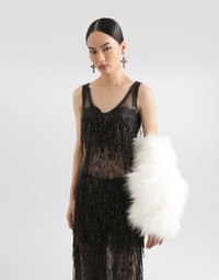 The Spring/Summer 2025 Women’s Collection is celebrating Italian beauty through bold and charismatic femininity. The 50s-inspired lingerie is the star, intermingling with fitted dresses, corsets and oversize trench coats. The iconic jackets have been updated with cropped cuts and modern inserts, while the floral prints add a romantic edge. The eveningwear shines with light fabrics and crystals, accompanied by look-defining accessories, from iconic bags to the cross earrings. Sleeveless calf-length marquisette dress with sequined fringing: • Black • Round neckline • Sleeveless • Unlined • Rear zipper and hook-and-eye fastening • The piece measures 80 cm from the waist down on a size IT 40 • The model is 175 cm tall and wears a size IT 40 • Made in Italy External composition: 100% Polyester