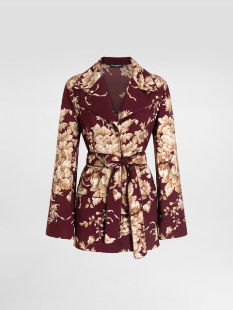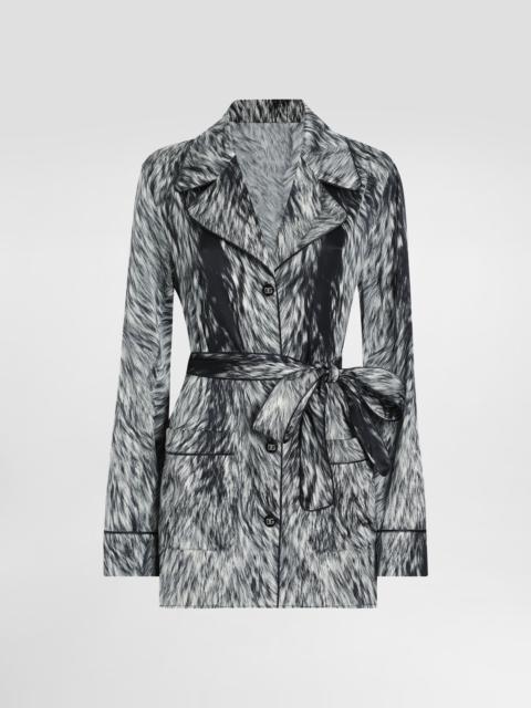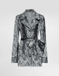 The Everyday Women's Collection reimagines contemporary daily wear with Dolce&Gabbana's signature style codes. Iconic fabrics mix with standout details like embroidered flowers, crystals, and jewel buttons, infusing elegance into every look. Gray animal print accented with green and purple, hyper-geometric jewelry, voluminous shapes and transparencies add unique touches. Men's tweed is reinvented with graphic twists, creating distinctive pieces that reflect refined sensuality. Silk satin pajama shirt with fur print: • Animal Print • Notched lapel collar • Long sleeves • Patch pockets • Regular fit • Button fastenings and belt • The piece measures 75 cm from the back of the neck on a size IT 40 • The model is 175 cm tall and wears a size IT 40 • Made in Italy The difference in the print placement that you may find on this product is a feature of Dolce&Gabbana’s “Handmade” pieces. A detail that makes every garment or accessory unique and exclusive. External composition: 92% Silk 8% Spandex