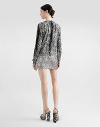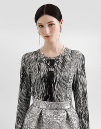 The Everyday Women's Collection reimagines contemporary daily wear with Dolce&Gabbana's signature style codes. Iconic fabrics mix with standout details like embroidered flowers, crystals, and jewel buttons, infusing elegance into every look. Gray animal print accented with green and purple, hyper-geometric jewelry, voluminous shapes and transparencies add unique touches. Men's tweed is reinvented with graphic twists, creating distinctive pieces that reflect refined sensuality. Fur-print silk sweater: • Animal Print • 18-gauge knit • Round neck • Long sleeves • French seam armholes • Dense hand • Ribbed neck and hem • Regular fit • The piece measures 55 cm from the shoulder seam on a size IT 40 • The model is 175 cm tall and wears a size IT 40 • Made in Italy External composition: 100% Silk
