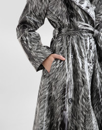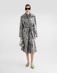 The Everyday Women's Collection reimagines contemporary daily wear with Dolce&Gabbana's signature style codes. Iconic fabrics mix with standout details like embroidered flowers, crystals, and jewel buttons, infusing elegance into every look. Gray animal print accented with green and purple, hyper-geometric jewelry, voluminous shapes and transparencies add unique touches. Men's tweed is reinvented with graphic twists, creating distinctive pieces that reflect refined sensuality. Fur-print coated satin trench coat: • Animal print • Notched lapels • Long sleeves • Side pockets • Stretch silk satin lining • Button fastenings and belt • The piece measures 120 cm from the center back on a size IT 40 • The model is 175 cm tall and wears a size IT 40 • Made in Italy The difference in the print placement that you may find on this product is a feature of Dolce&Gabbana’s “Handmade” pieces. A detail that makes every garment or accessory unique and exclusive. External composition: 97% Polyester 03% Spandex Internal composition: 92% Silk 8% Spandex