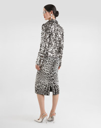 The Everyday Women's Collection reimagines contemporary daily wear with Dolce&Gabbana's signature style codes. Iconic fabrics mix with standout details like embroidered flowers, crystals, and jewel buttons, infusing elegance into every look. Gray animal print accented with green and purple, hyper-geometric jewelry, voluminous shapes and transparencies add unique touches. Men's tweed is reinvented with graphic twists, creating distinctive pieces that reflect refined sensuality. Silk tank top with fur print: • Animal Print • 18-gauge knit • Round neck • Sleeveless • Ribbed neck and hem • Regular fit • The piece measures 55 cm from the shoulder seam on a size IT 40 • The model is 175 cm tall and wears a size IT 40 • Made in Italy External composition: 100% Silk