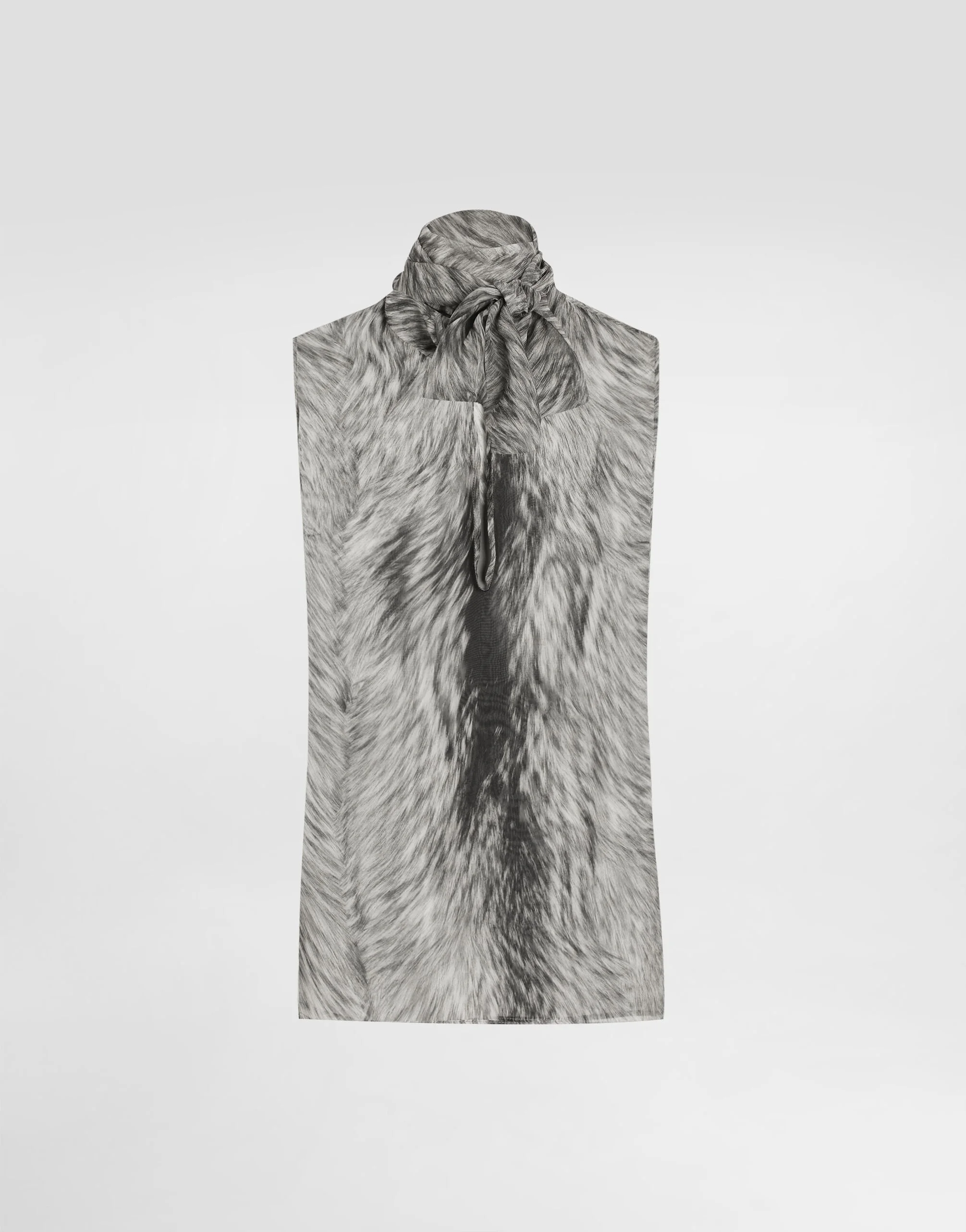 The Everyday Women's Collection reimagines contemporary daily wear with Dolce&Gabbana's signature style codes. Iconic fabrics mix with standout details like embroidered flowers, crystals, and jewel buttons, infusing elegance into every look. Gray animal print accented with green and purple, hyper-geometric jewelry, voluminous shapes and transparencies add unique touches. Men's tweed is reinvented with graphic twists, creating distinctive pieces that reflect refined sensuality. Silk chiffon pussy-bow top with fur print: • Animal print • Crew-neck with keyhole opening on front and pussy-bow • Sleeveless • Regular fit • Unlined • The piece measures 67 cm from the center back on a size IT 40 • The model is 175 cm tall and wears a size IT 40 • Made in Italy The difference in the print placement that you may find on this product is a feature of Dolce&Gabbana’s “Handmade” pieces. A detail that makes every garment or accessory unique and exclusive. External composition: 100% Silk