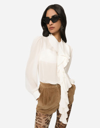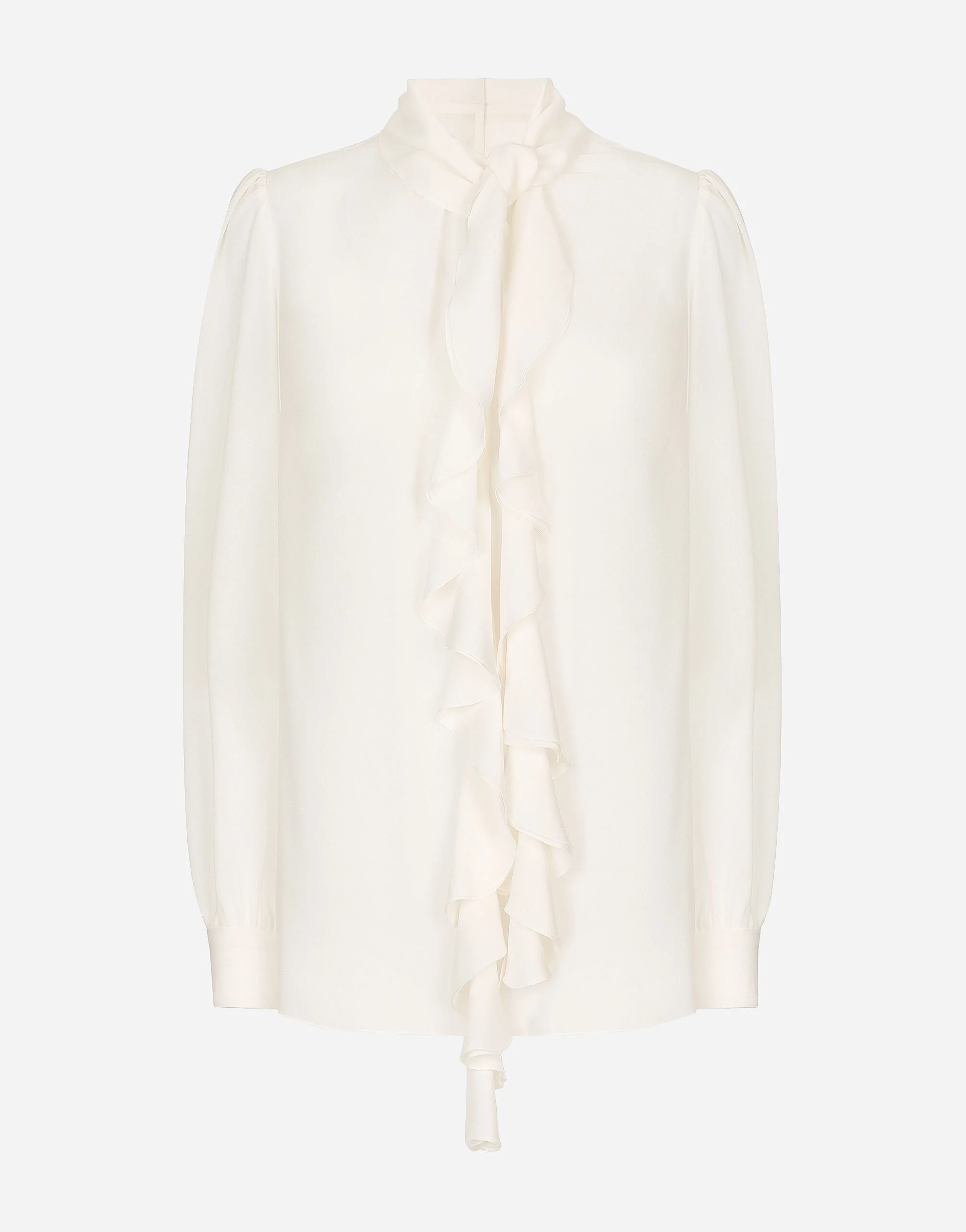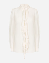 Silk georgette blouse with ruches: • White • Round neck with ruches • Long sleeves • Regular fit • Unlined • Keyhole fastening at the back with small press-stud buttons • The piece measures 68 cm from the center back on a size IT 40 • The model is 175 cm tall and wears a size IT 40 • Made in Italy Care And Details External composition: 100% Silk