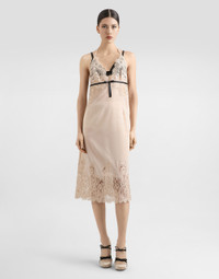 The Spring/Summer 2025 Women’s Collection is celebrating Italian beauty through bold and charismatic femininity. The 50s-inspired lingerie is the star, intermingling with fitted dresses, corsets and oversize trench coats. The iconic jackets have been updated with cropped cuts and modern inserts, while the floral prints add a romantic edge. The eveningwear shines with light fabrics and crystals, accompanied by look-defining accessories, from iconic bags to the cross earrings. Georgette slip dress with lace details: • Beige • Triangle cups • Unlined • Thin adjustable straps • Rear lace and hook-and-eye fastening • The model is 175 cm tall and wears a size IT 40 • Made in Italy External composition: 85% Silk 8% Cotton 5% Spandex 2% Polyamide