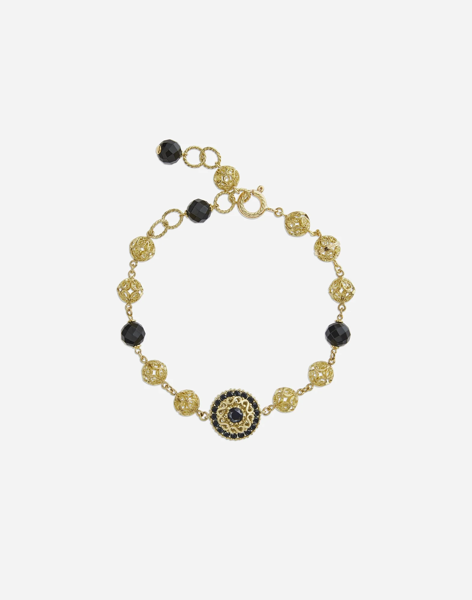 This bracelet is composed of round faceted black jades, spheres of gold filigree – an ancient technique still practised in Liguria – and a rosette modelled in the round and embellished by black sapphires. The chromatic contrast between the yellow of the gold and the black of the gemstones accentuates both the refined elegance of the metalwork and the preciousness of the materials. • Gold 18 Kt. • Length. 19 + 5 cm adjustable. • Gemstones. 4 black jade beads, 38 round black sapphires • Made in Italy Material: Yellow 18 kt Gold