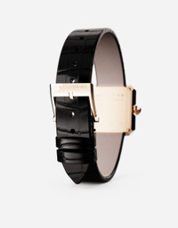 Watch from the SOFIA line with black alligator strap. • Material. 18 Kt pink gold - Size. 24 x 24 mm - Glass. “sapphire” glass with geometrical facets - Crown. 18 Kt pink gold set with 1 rose cut diamond • Gemstones. 91 colourless diamonds 0.62 ct approximately, quality range. colour D-G, clarity VS-SI. • Water resistance. 3BAR/3ATM • Dial black enamelled, without markers with pink gold plated logo at 6 o’clock • Electronic quartz movement powered by a 1.5 V, 3 years life battery. • Calibre. ETA E01.001 Swiss Made • Size. 11 mm diameter, h 2.5 mm • Frequency of the quartz. 32,768 Hz • Number of rubies. 3 • Strap. black alligator • Clasp. pin buckle in 18 Kt pink gold • Swissmade Add your personal touch to this item such as your initials or a customized message. Send the request to CustomerServiceJewelleryWatches@dolcegabbana.it. If the item has been customized then it cannot be returned. Material: Red 18 kt Gold Indication of hours and minutes Bottom clasp: with four side screws and safety closure Hands: pink gold plated, “sword shaped” POST-SELLING WATCHES MAINTENANCE To maintain the sheen of the watch and metal bracelet, we recommend using mild soap and rinsing thoroughly with warm water. Dry with a soft cloth. We recommend this being done also after a swim in the sea or pool. It is advisable to avoid direct contact with solvents, detergents, perfumes and cosmetic products, which might damage the case, seals, bracelet and/or strap. It is advisable to protect the watch from falls and shocks, which could not only seriously damage the finish, but might affect the mechanical functions also, as well as the water resistance and accuracy of the watch. Temperatures above 60° C and below -10° C , sudden changes in pressure, density and temperature, magnetic fields, and many other factors can affect the accuracy of the watch. If you note any irregularities in operation, the watch should be taken to an authorised Dolce&Gabbana retailer. The Dolce&Gabbana watch is a high-precision timepiece. Despite the care watchmakers have dedicated to making it, the influence of magnetic fields, sudden temperature change and even the lifestyle of the wearer may result in minor irregularities. To ensure optimal operation, it is recommended that a comprehensive inspection be effected every three or four years. The owners of the watch can benefit from a global network of Dolce&Gabbana retailers, which alone are authorised to carry out operations on the watch. In the same way, for the electronic quartz movement, it is recommended that the battery be replaced by an authorised Dolce&Gabbana retailer, which will at the same time check the proper functioning and water resistance of the watch. During maintenance, the battery and any electrical parts are collected and disposed of in accordance with current regulations.