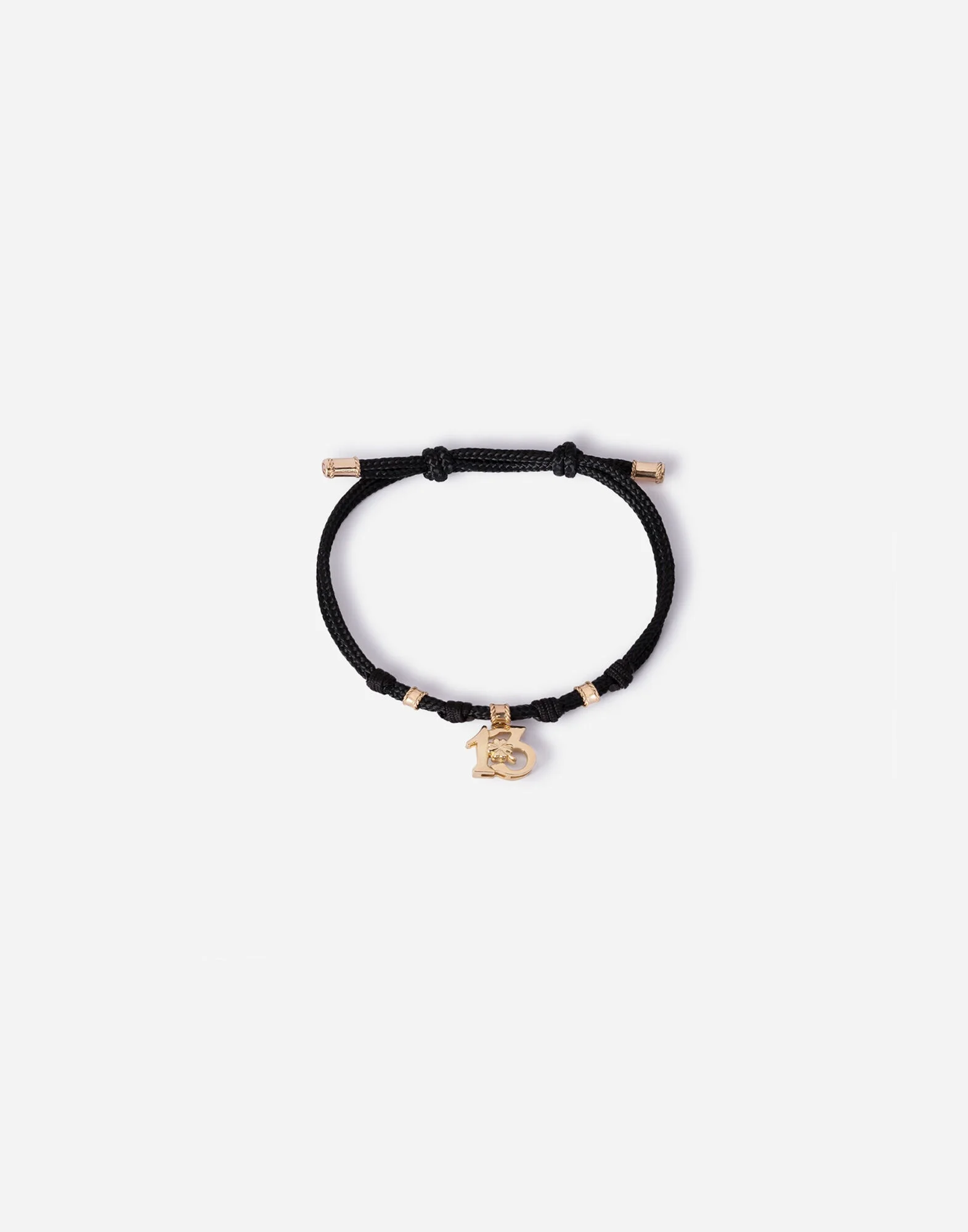 The bracelet consists of an adjustable cord made of hand-knotted fabric and a pendant in the shape of the number 13, enriched by a small embossed four-leaf clover, both good luck symbols. The composition is enhanced by two spacers decorated with twisted wire and two ends in yellow gold on which the logo is displayed on the front. Technical features: Gold 750/000. Black waterproof cord adjustable up to a circumference of 25 cm. Made in Italy Yellow gold 750/000