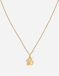 The necklace consists of a "rolo" chain in yellow gold and a pendant in the shape of the number 13 decorated with a four-leaf clover, both are good luck symbols. An oval tag bearing the DOLCE&GABBANA logo is placed before the closure. Technical features: Gold 750/000 Length: 55 + 10 cm adjustable. Made in Italy External Composition: Yellow Gold 750/000