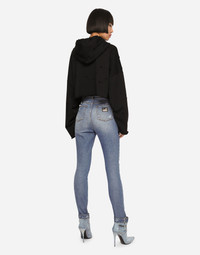 Grace jeans with ripped details: • Regular rise • 5 pockets • Branded label on the coin pocket • Branded metal and leather tag on the back pocket • Inner leg: 73 cm • Hem: 12.7 cm • Metal button with logo and zipper • The model is 175 cm tall and wears a size IT 40 • Made in Italy The difference in the print placement that you may find on this product is a feature of Dolce&Gabbana’s “Handmade” pieces. A detail that makes every garment or accessory unique and exclusive. Care And Details External composition: 98% Cotton 2% Spandex