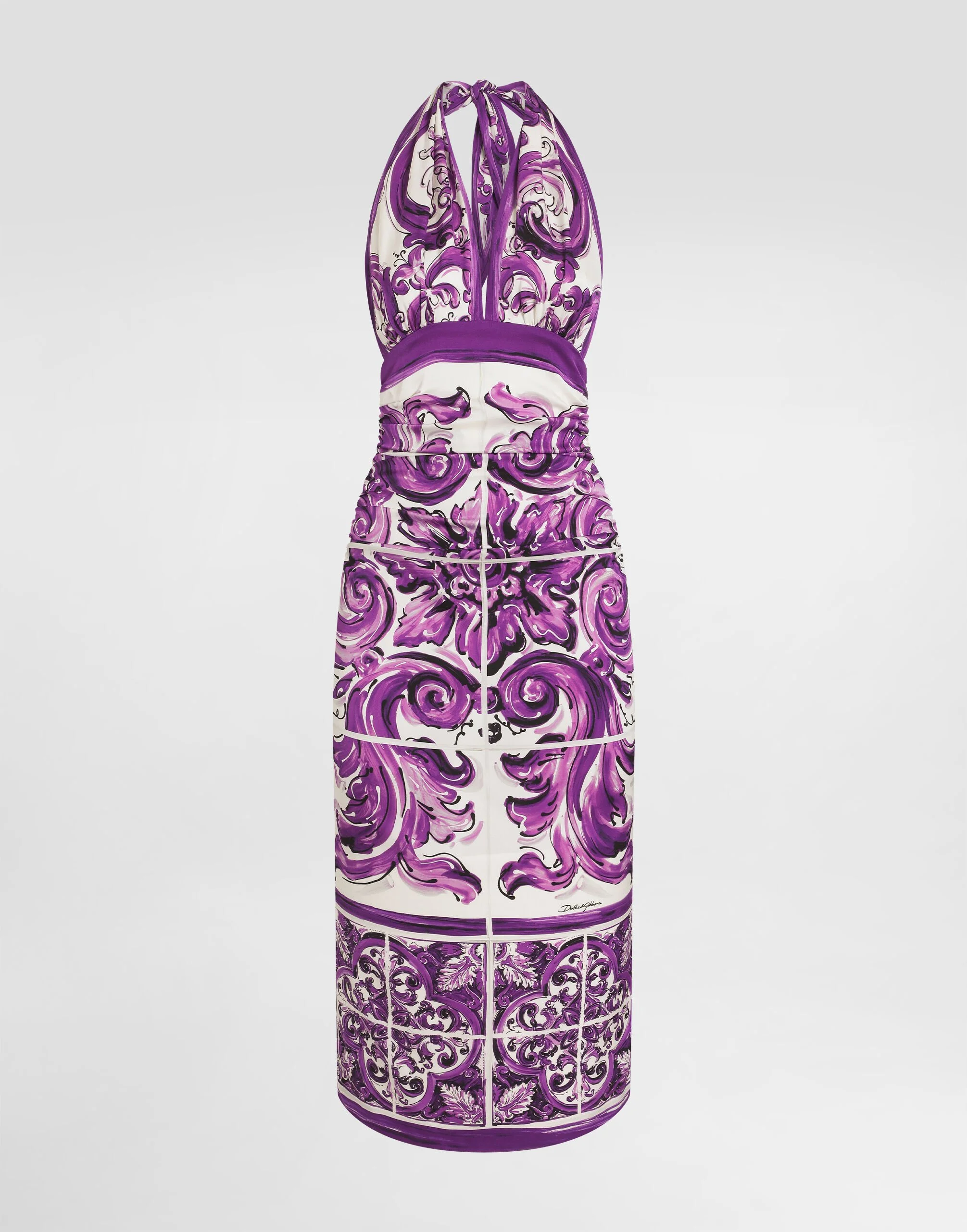 This dress in elastic charmeuse with Majolica print is a perfect combination of elegance and modernity. The sophisticated design and fine workmanship make it ideal for evening events and special occasions. Charmeuse dress with Majolica print: • Multi-coloured • With neck knotting • High-waisted pencil skirt with drape • Slit topped at center front • Covered zip • The model is 175 cm tall and wears size 40 IT • Made in Italy The difference in the print placement that you may find on this product is a feature of Dolce&Gabbana’s “Handmade” pieces. A detail that makes every garment or accessory unique and exclusive. External Composition: 91% Silk, 9% ElastaneInternal Composition: 91% Silk, 9% Elastane