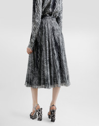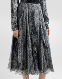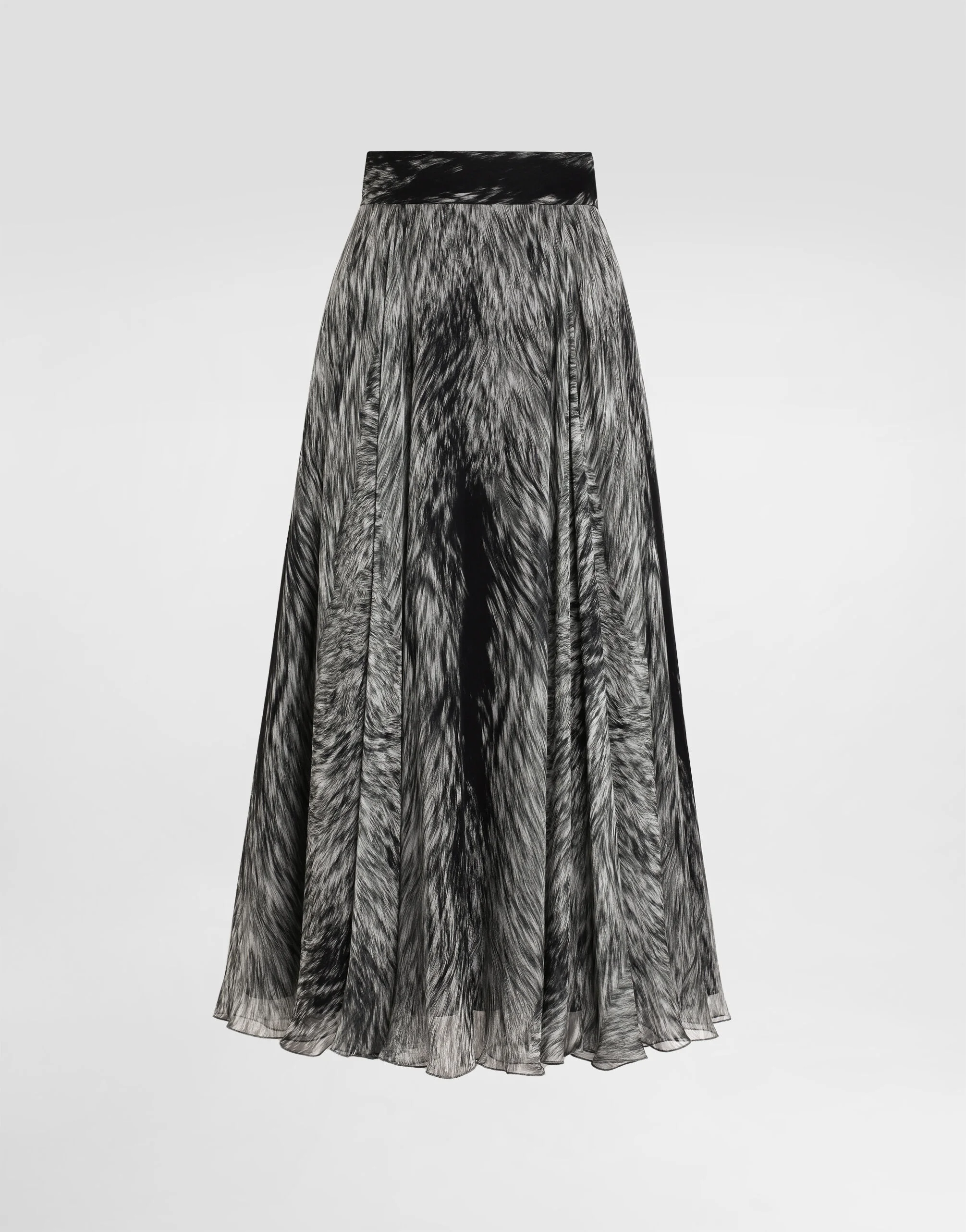 The Everyday Women's Collection reimagines contemporary daily wear with Dolce&Gabbana's signature style codes. Iconic fabrics mix with standout details like embroidered flowers, crystals, and jewel buttons, infusing elegance into every look. Gray animal print accented with green and purple, hyper-geometric jewelry, voluminous shapes and transparencies add unique touches. Men's tweed is reinvented with graphic twists, creating distinctive pieces that reflect refined sensuality. Silk chiffon calf-length circle skirt with fur print: • Animal print • High-waisted • Stretch silk satin lining • Rear zipper and hook-and-bar fastening • The piece measures 80 cm from the waist down on a size IT 40 • The model is 175 cm tall and wears a size IT 40 • Made in Italy The difference in the print placement that you may find on this product is a feature of Dolce&Gabbana’s “Handmade” pieces. A detail that makes every garment or accessory unique and exclusive. External composition: 100% Silk Internal composition: 92% Silk 8% Spandex
