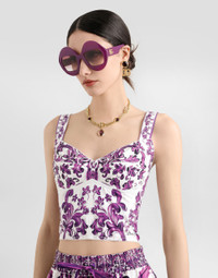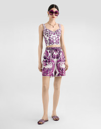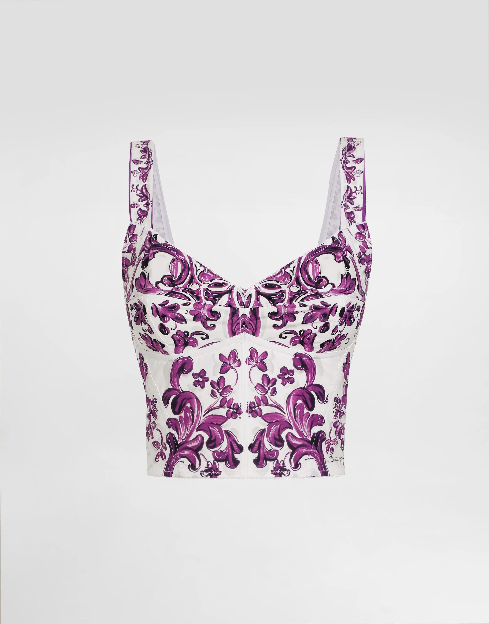This cotton poplin bustier with Majolica print is a garment that combines elegance and modernity, ideal for those who want a sophisticated and unique look. Cotton poplin bustier with Majolica print: • Multi-coloured • Canvas lining • Elastic lined back panel • Waistband at the center back • Length from shoulder point 18 cm on size 40 IT • The model is 175 cm tall and wears size 40 IT • Made in Italy The difference in the print placement that you may find on this product is a feature of Dolce&Gabbana’s “Handmade” pieces. A detail that makes every garment or accessory unique and exclusive. External Composition: 70% Cotton, 25% Polyamide, 5% ElastaneInternal Composition: 68% Cotton, 22% Polyamide, 10% Elastane