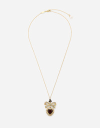 Necklace featuring a thin “belcher” chain and a romantic bow-shaped pendant adorned with grey sapphires and a red rhodolite garnet heart set in a delicate lacework frame. The pendant is attached to the necklace by a clover of black sapphires. A round pearl has been added to the final link on the adjustment chain and an oval tag with the "DOLCE&GABBANA" logo is placed beside the closure. Technical specifications. • Gold 18 Kt. • Length. 45 + 5 cm adjustable. • Gemstones. 1 heart-shaped red rhodolite garnet, 23 round grey sapphires, 3 black round sapphires, 1 freshwater spherical pearl • Made in Italy External composition: Yellow 18 kt Gold