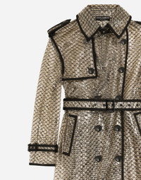 In the “WOMAN SS 24” Collection, the imagery of old Sicily interacts with the masculine, with sensual shapes, lace, nude tones and delicate overlays, to create pieces that move amid clean silhouettes, the elegance of the 1960s, the contrasts of black and white and luxurious textures. The designers are reworking their signature style and their iconic Sicilia black color to convey an aware, seductive and confident Sicilian WOMAN who is imbued with sensuality. PVC-bonded lurex mesh trench coat: • Transparent • Notched lapels • Long sleeves • Unlined • Button fastenings and belt • The piece measures 130 cm from the center back on a size IT 40 • The model is 175 cm tall and wears a size IT 40 • Made in Italy External composition: 76% Polyester 16% Silk 08% Polyamide