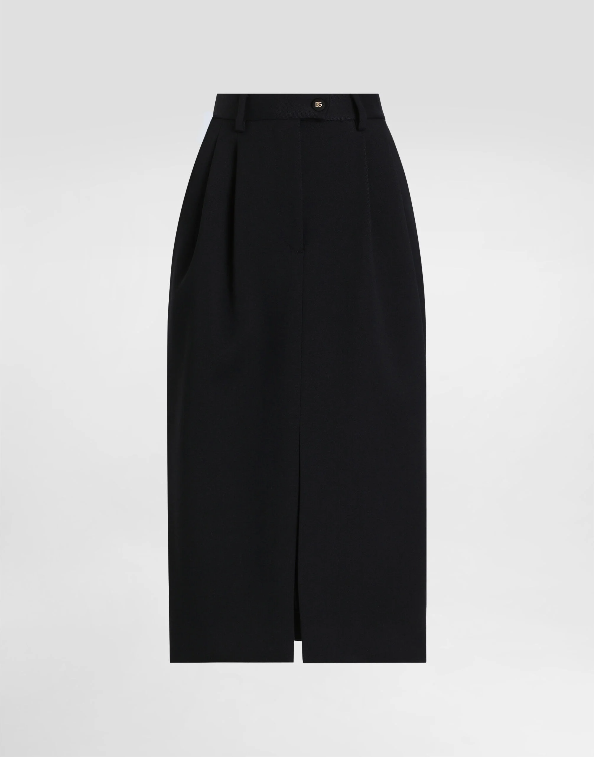 The Women's Black Sicily Collection reinforces Dolce&Gabbana's iconic fabrics and codes rooted in Italian heritage. Sensual silhouettes, highlighted by floral prints and refined corsetry, evoke an intriguing elegance, while the iconic black lace, satin, and velvet dominate the collection. Denim in various shades of blue introduces a contemporary twist, balancing the classic and modern. Embroidered crosses, medals, and jewelry add a sophisticated touch. Wool calf-length pencil skirt: • Black • High-waisted • Welt back pockets with DG logo buttons • Front slit • Unlined • Front zipper and DG logo button fastening • The piece measures 75 cm from the waist down on a size IT 40 • The model is 175 cm tall and wears a size IT 40 • Made in Italy External composition: 100% Virgin Wool