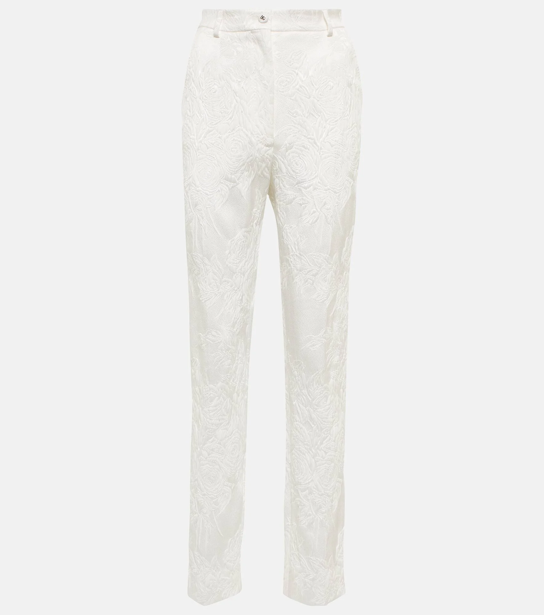 Sitting high on the waist with straight legs, these pants from Dolce & Gabbana feature tonal floral embroidery. Product Details - Lining: 92% silk, 8% elastane, partially lined - Material: 50% cotton, 49% viscose, 1% elastane - Made in Italy - Designer color name: Bianco - Belt loops - Closure: zipper fly, button fastening - Pockets: side slit pockets, back pockets - Care instructions: dry clean - Item number: P00705257 Size & Fit - True to size - Straight leg - High-waisted - The model seen in the picture is 178cm-5'10" and wearing a size IT 40
