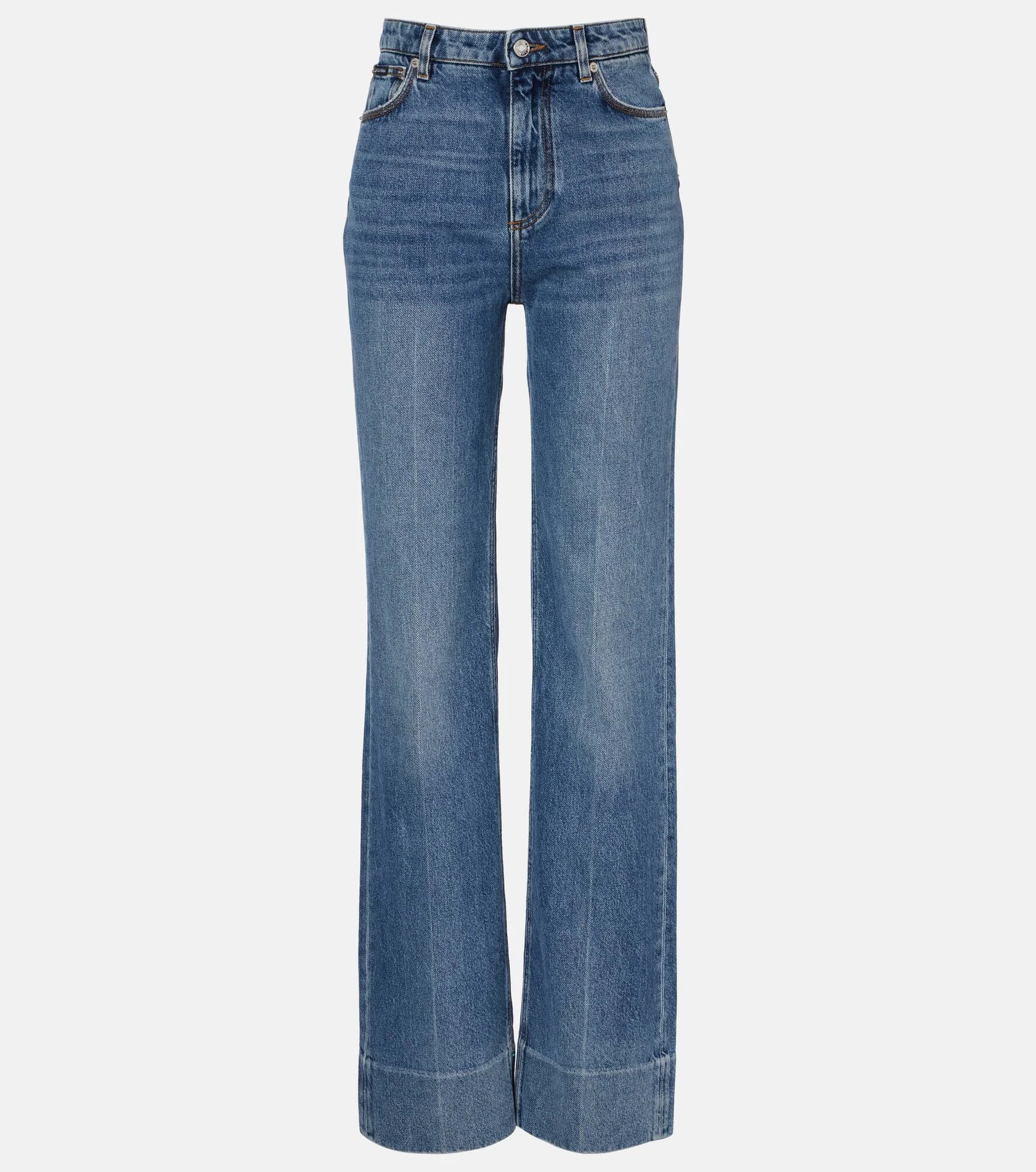 These Dolce&Gabbana straight jeans are designed with a high-rise silhouette and subtle creases for a refined finish. The style is complete with a plaque at the back and seams that create a folded effect at the bottom. Product Details - Material: 100% cotton - Care instructions: machine wash at 30 degrees - Made in Italy - Designer color name: Variante Abbinata - Item color: blue - Closure: zipper fly, button fastening - Pockets: five pockets - Belt loops - Item number: P01052489 Size & Fit - True to size - Non-stretchy fabric - Straight leg - High-rise - The model seen in the picture is 178cm-5'10" and wearing a size IT 40