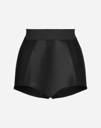 Menswear and womenswear mix and mingle, influencing one another and creating tailoring that embraces endless nuances, from the boldest to the most sophisticated, to define the rules of eternally classy femininity. A monochrome retelling in Nero Sicilia black, embellished by golden touches and rhinestones, adorning clean lines and incorporating stylish fabrics such as velvet, chiffon, lace, organza, and unique mesh details, the expression of authentic beauty for dresses, shirts and accessories. Stretch marquisette and satin high-waisted panties: • Black • Dolce high waist with stretch waistband • Stretch marquisette back • Zipper fastening at the back • The model is 175 cm tall and wears a size IT 40 • Made in Italy External composition: 60% Polyamide 30% Polyester 10% Spandex Internal composition: 30% Cotton 17% Spandex 53% Polyamide