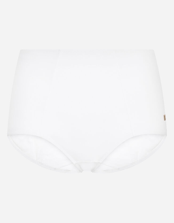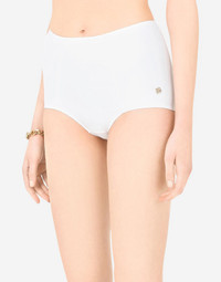 These iconic 50s-style high-waisted bikini bottoms from Dolce&Gabbana, that today are oh-so current, come in fine spandex fabric: • High-waisted • DG logo in nickel-free gold-plated metal on the front side • Matching PVC pouch • Made in Italy Care And Details External composition: 75% Polyamide 25% Spandex