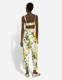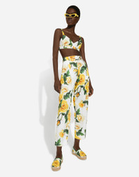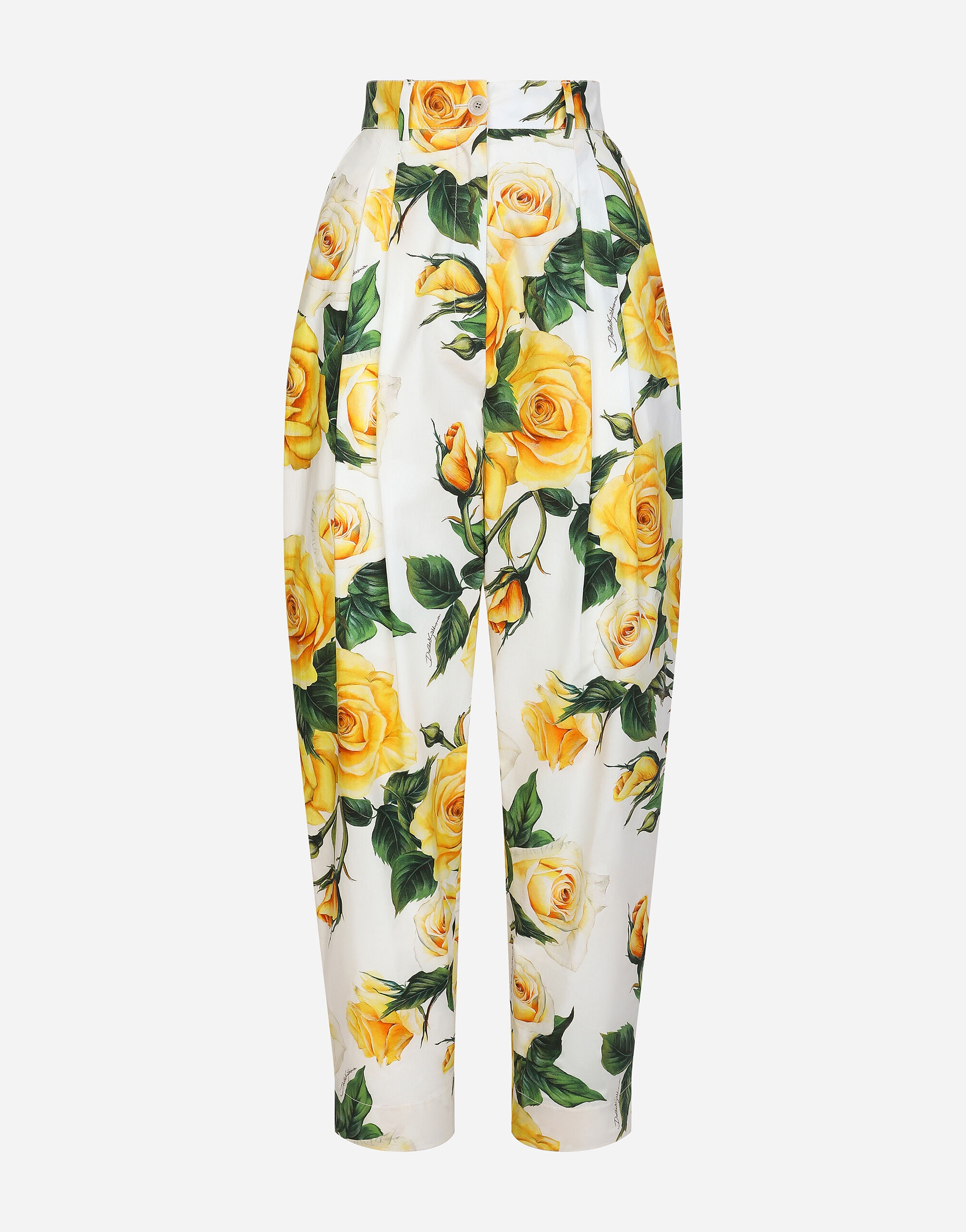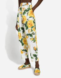 The Flowering Collection has us dreaming of faraway destinations, the most exclusive ones in the world, inviting us through the colors and the yellow rose print to take refuge in warm and unique places. Light White, lemon yellow, polka-dot accents and the various shades of leaf green for vibrant and ultra-feminine pieces where the keyword is tailoring. Every look invites us to savor and dream every moment of our free time, to discover beauty and enhance our femininity. High-waisted cotton poplin pants with yellow rose print: • Multi-colored • Dolce high waist • Slant front pockets • Welt back pockets • Belt loops • Inner leg: cm • Hem: cm • Zipper and button fastening • The model is 175 cm tall and wears a size IT 40 • Made in Italy The difference in the print placement that you may find on this product is a feature of Dolce&Gabbana’s “Handmade” pieces. A detail that makes every garment or accessory unique and exclusive. External composition: 100% Cotton