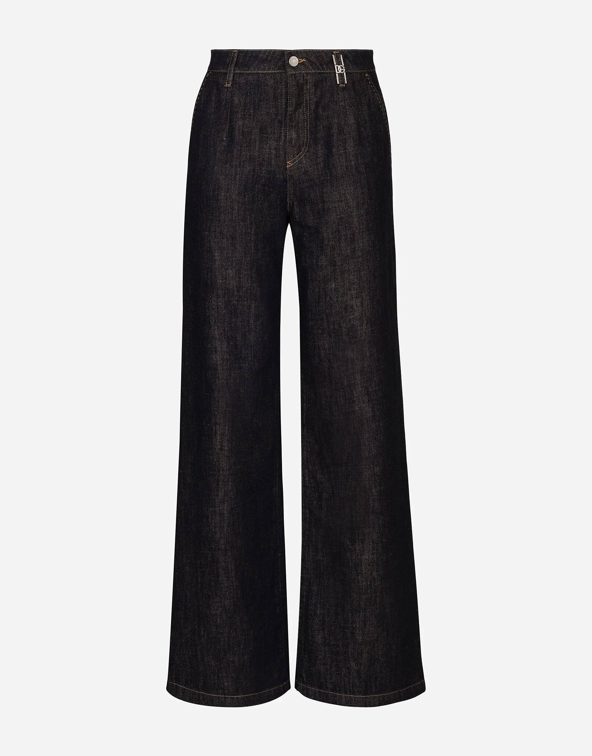 Dolce&Gabbana is conveying a new way of interpreting denim and does so by drawing inspiration from key words such as glamor and signature aesthetic, creating a collection that is perfect for every style and personality, merging femininity, modernity and originality. Blue rinse cotton denim palazzo jeans: • Blue • Regular rise • 5 pockets • Branded label on the coin pocket • Tobacco brown top-stitching on pockets • Metal DG logo on front belt loop • Leg length from waistband: 116 cm • Hem: 30 cm • Zipper and branded metal button fastening • The model is 175 cm tall and wears a size IT 40 • Made in Italy External composition: 100% Cotton