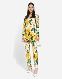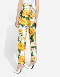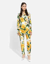 The Flowering Collection has us dreaming of faraway destinations, the most exclusive ones in the world, inviting us through the colors and the yellow rose print to take refuge in warm and unique places. Light White, lemon yellow, polka-dot accents and the various shades of leaf green for vibrant and ultra-feminine pieces where the keyword is tailoring. Every look invites us to savor and dream every moment of our free time, to discover beauty and enhance our femininity. High-waisted silk mikado pants with yellow rose print: • Multi-colored • Dolce high waist • Slant front pockets • Welt back pockets • Belt loops • Inner leg: 74 cm • Hem: 17 cm • Zipper and button fastening • The model is 175 cm tall and wears a size IT 40 • Made in Italy The difference in the print placement that you may find on this product is a feature of Dolce&Gabbana’s “Handmade” pieces. A detail that makes every garment or accessory unique and exclusive. External composition: 74% Silk 26% Viscose
