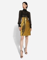 The Holiday collection is an extraordinary story that brings together two worlds: Dolce&Gabbana and the great stars from Hollywood’s Golden Age, who were recognized and admired for their wonderful dresses and extraordinarily glamorous looks. The designers are reinventing and making us dream in front of tailored pieces with breathtaking elegance and visual impact, a sparkling mood that will give everyone a modern, recognizable and unique allure on any occasion. High-waisted sequined midi skirt: • Gold • High-waisted • Stretch silk satin lining • Rear zipper and hook-and-eye fastening • The piece measures 55 cm from the waist without belt down on a size IT 40 • The model is 175 cm tall and wears a size IT 40 • Made in Italy External composition: 100% Polyester Internal composition: 92% Silk 8% Spandex