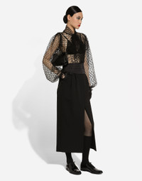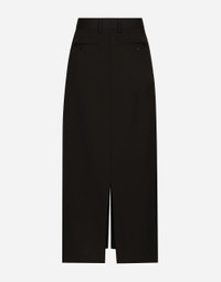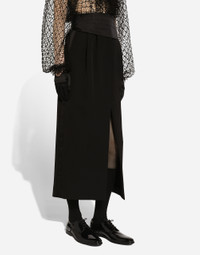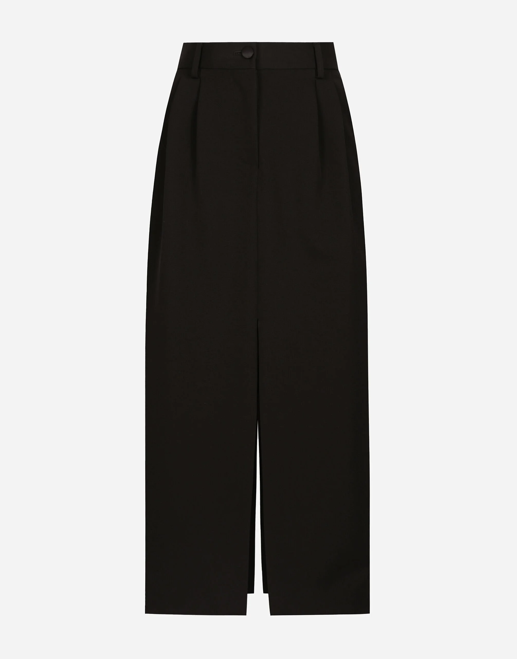 Menswear and womenswear mix and mingle, influencing one another and creating tailoring that embraces endless nuances, from the boldest to the most sophisticated, to define the rules of eternally classy femininity. A monochrome retelling in Nero Sicilia black, embellished by golden touches and rhinestones, adorning clean lines and incorporating stylish fabrics such as velvet, chiffon, lace, organza, and unique mesh details, the expression of authentic beauty for dresses, shirts and accessories. Wool gabardine calf-length tuxedo pencil skirt: • Black • High-waisted • Double darts • Slant front pockets and welt back pockets • Front and back slit • Unlined • Front zipper and button fastening • The piece measures 90 cm from the waist down on a size IT 40 • The model is 175 cm tall and wears a size IT 40 • Made in Italy External composition: 90% Virgin Wool 08% Silk 02% Polyester