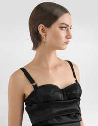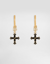 The SS26 Women's Fashion Show Collection is the result of a play of harmonious contrasts: masculine and feminine, day and evening, tailored and casual. Pyjamas take centre stage, paired with lingerie and formal garments. The play of layers and the mix of different influences contribute to expressing the relaxed attitude and unique, original style at the heart of the collection. Add a sophisticated and symbolic touch to any look: these gold-toned earrings, featuring a cross and sparkling strass, combine style and meaning, elevating every outfit. Hoop earrings with crosses and rhinestones: • Gold • Length: 4 cm • Width: 2.7 cm • Made in Italy External Composition: 40% Steel, 40% Brass, 20% Glass