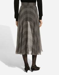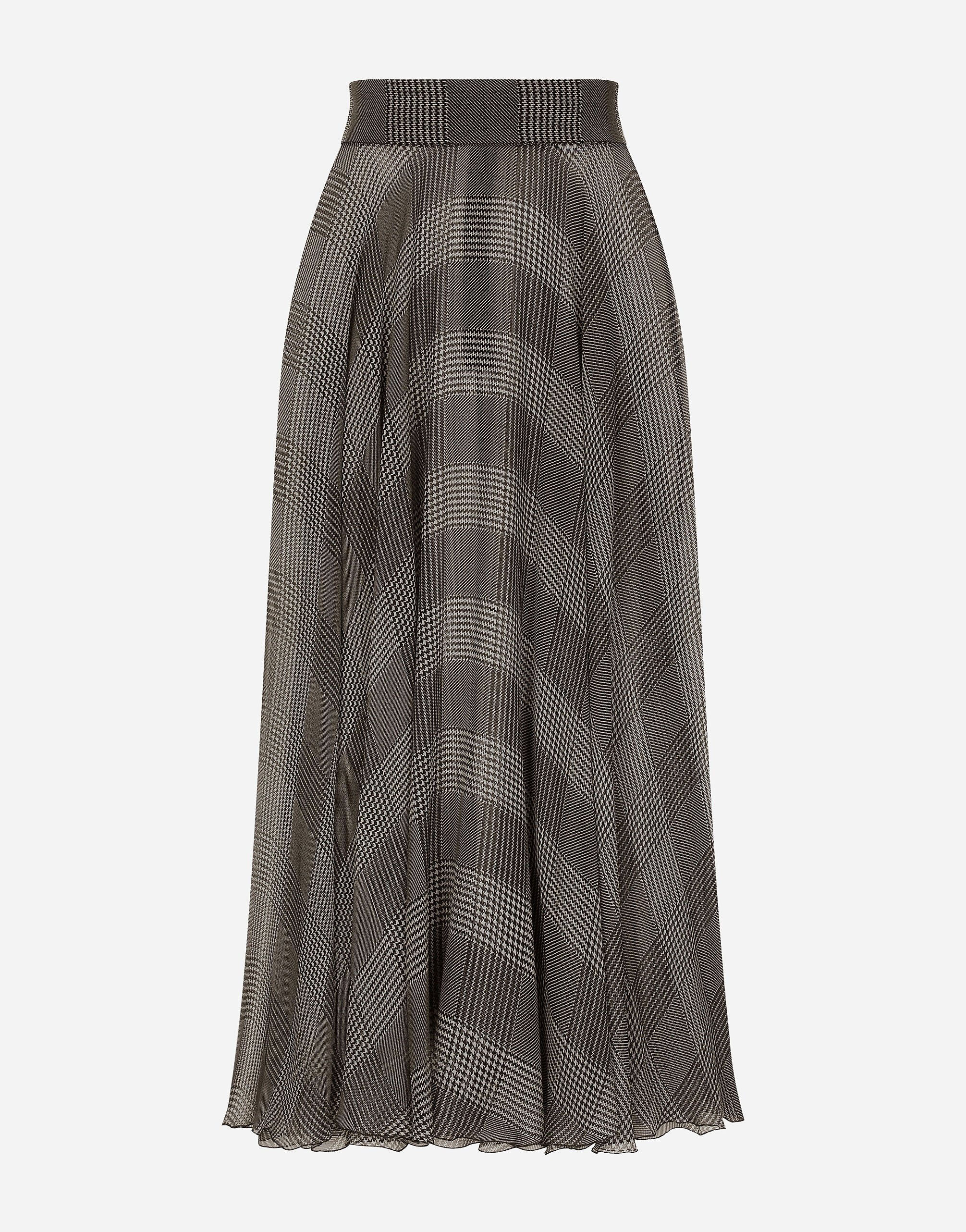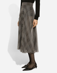 Inspired by 80s fashion photography, the Black Sicily collection masterfully blends masculine and feminine elements, pairing tailored cuts and corset details for the FW 24/25 season. A new vision of the iconic Nero Sicilia black is conveyed through contemporary and sensual looks: jackets and skirts in all-over glen plaid pair with openwork socks, while the 50s-inspired Mun shoes with Eva heel go with the houndstooth Sicily bag featuring crocodile-print leather inserts. Silk chiffon calf-length circle skirt with glen plaid print: • Gray • High-waisted • Stretch silk crepe de chine underskirt • Rear zipper and hook-and-eye fastening • The piece measures 75 cm from the waist down on a size IT 40 • The model is 175 cm tall and wears a size IT 40 • Made in Italy External composition: 100% Silk Internal composition: 91% Silk 9% Spandex