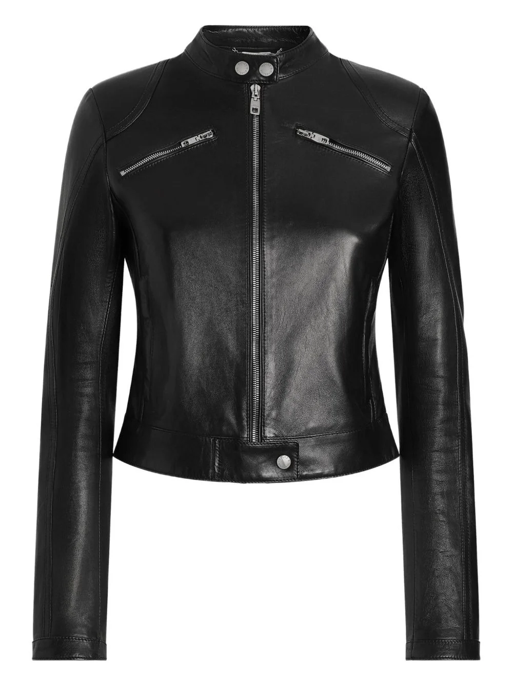 biker-style leather jacket Highlights - Black - Zip fastening - Zippered chest pockets - High collar - Long sleeves Made in Italy Composition Outer: Lambskin 100% Lining: Silk 92%, Spandex/Elastane 8%
